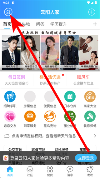 1、打开云阳人家APP,点击首页左上角的个人头像,进入个人页面。