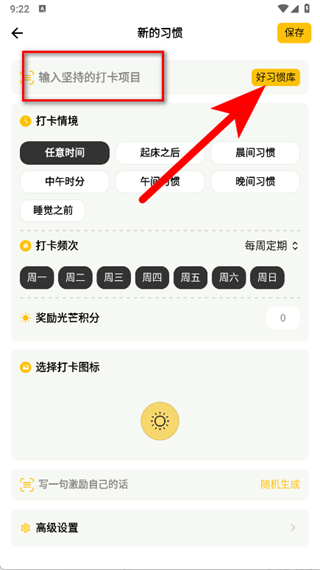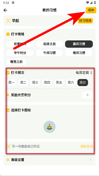 4、选好后设置打卡情境、频次等,点击右上角保存,完成习惯创建。