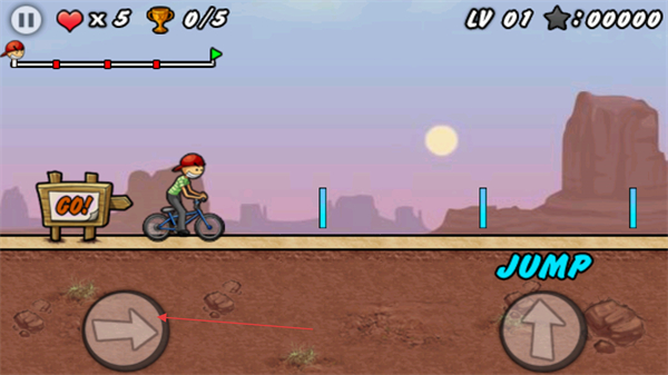 1、游戏开始,点击左侧方向键控制单车男孩前进,看到GO!标志后正式开始骑行。