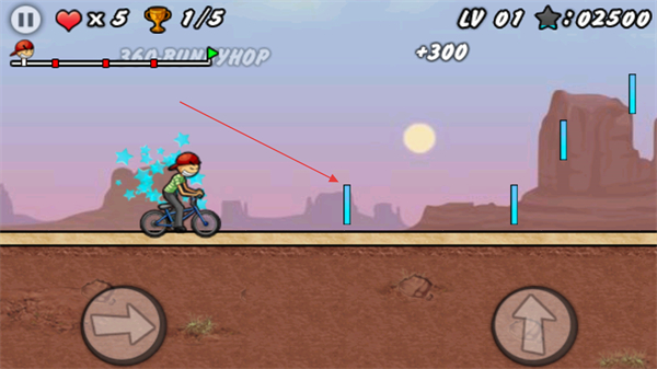 2、骑行过程中,遇到蓝色竖杆障碍,及时点击右侧JUMP按钮控制男孩跳跃躲避。
