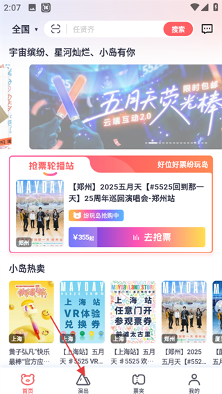 1、进入纷玩岛,在首页点击底部演出,进入演出页面。