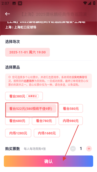 4、在票品选择页面,选择好信息后,点击确认,进入订单确认页面。