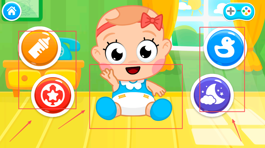 1、进入游戏来到宝宝房间开始照顾任务,认识各种生活用品和玩具的准备位置及使用方法,熟悉不同区域的功能划分。