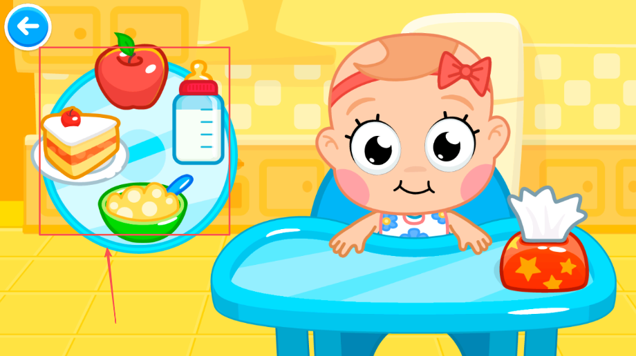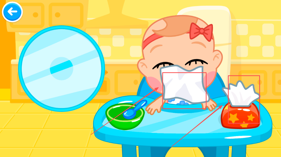 2、按照提示给宝宝喂饭喂水并清洁,学习正确使用餐具的方法并记得饭后帮宝宝擦干净嘴巴,培养卫生习惯。