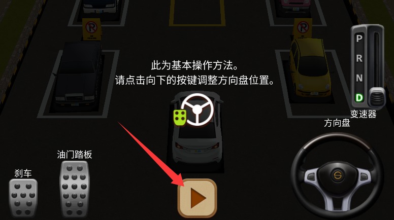 4、使用左侧刹车与油门踏板精准控制车速,通过右侧虚拟方向盘灵活调整行驶方向完成泊车。