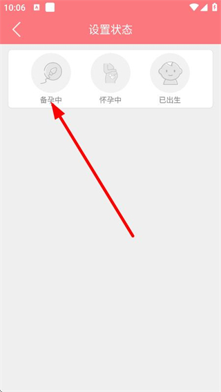 2、在设置状态页面,点击备孕中,进入备孕中信息填写页面。