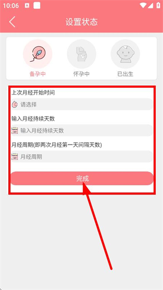 3、选择上次月经开始时间、输入月经持续天数和月经周期后,点击完成,完成状态设置。