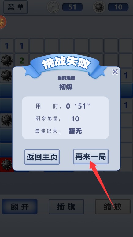 3、若不幸点中隐藏的地雷则立即失败,需要重新开始当前关卡的挑战过程。