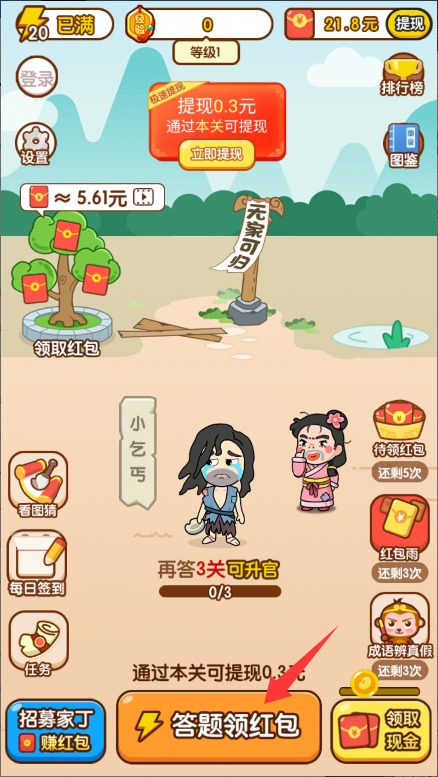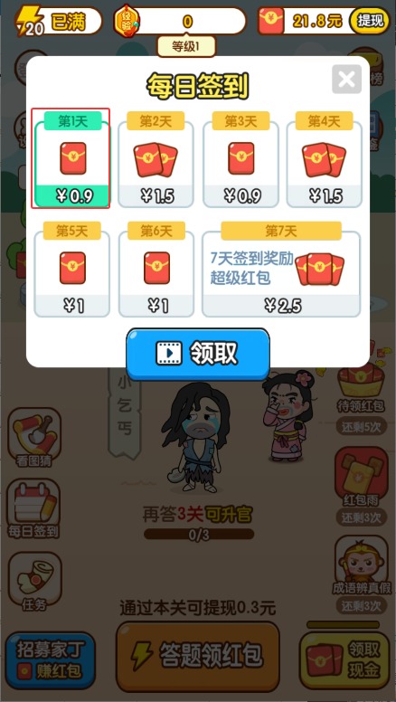 1、每日登录游戏后点击签到按钮领取红包奖励,连续签到可获得额外加成奖励与道具礼包。
