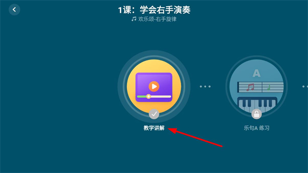 3、学会右手演奏的学习页面,点击教学讲解,观看教学视频。