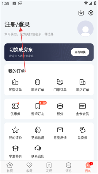 1、进入木鸟短租,在首页点击底部我的,进入个人页面。