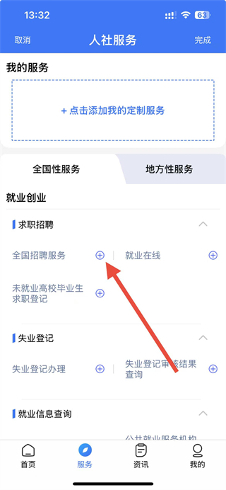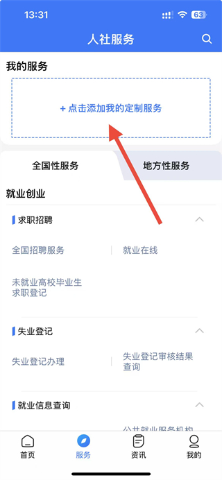 2、在服务页面,点击添加我的定制服务区域。