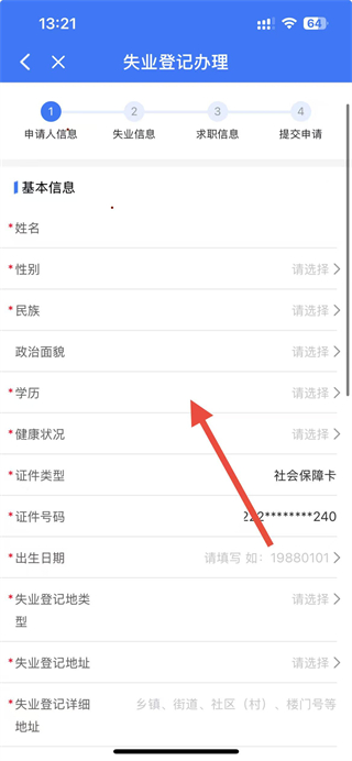 3、在失业登记办理页面,填写申请人信息、失业信息等内容。