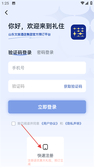3、在登录页面,若为新用户,点击快速注册,进入新用户注册页面。