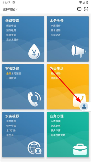 1、打开指尖水务app,点击个人中心图标,进入个人中心页面。