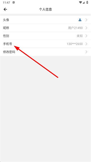 3、在个人信息页面,点击手机号选项,进入修改手机号页面。