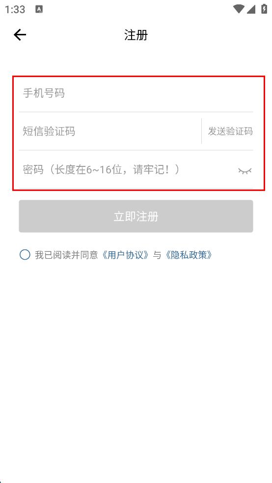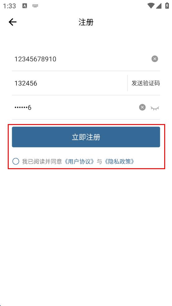 4、信息输入完成后,勾选我已阅读并同意用户协议与隐私政策选项,然后点击立即注册按钮,完成新用户注册。