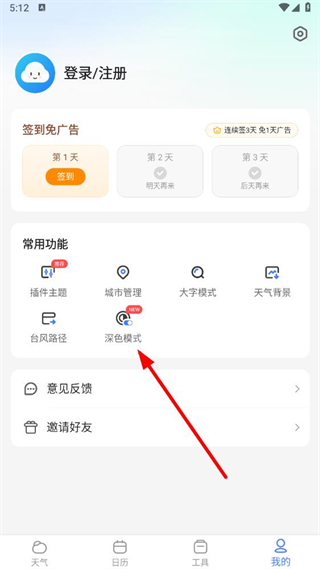 2、在我的页面,点击深色模式选项。