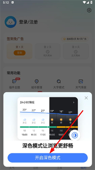 3、在弹出的提示框中,点击开启深色模式按钮。