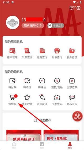 2、在个人页面中,找到购物车选项并点击进入购物车界面。