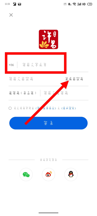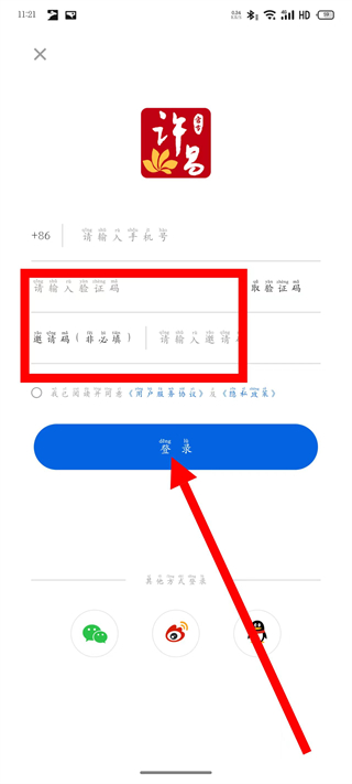 3、进入登录页面,填写手机号,点击获取验证码,输入收到的验证码。