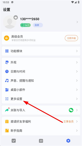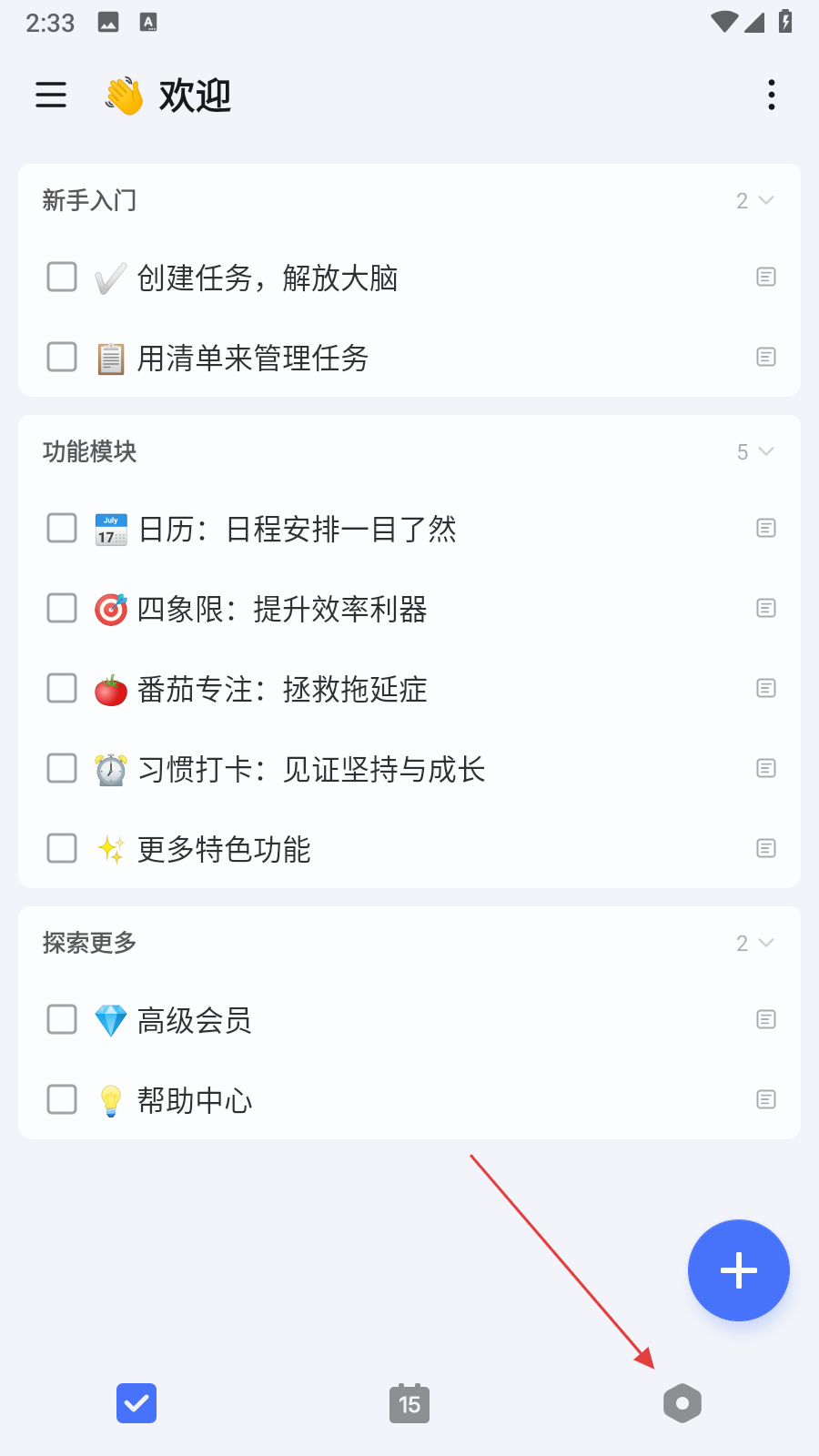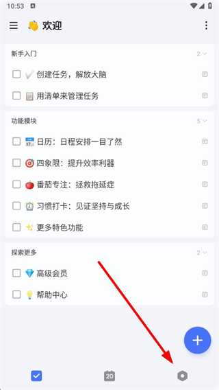 1、打开滴答清单应用,在主界面点击右下角的设置图标,进入设置页面。