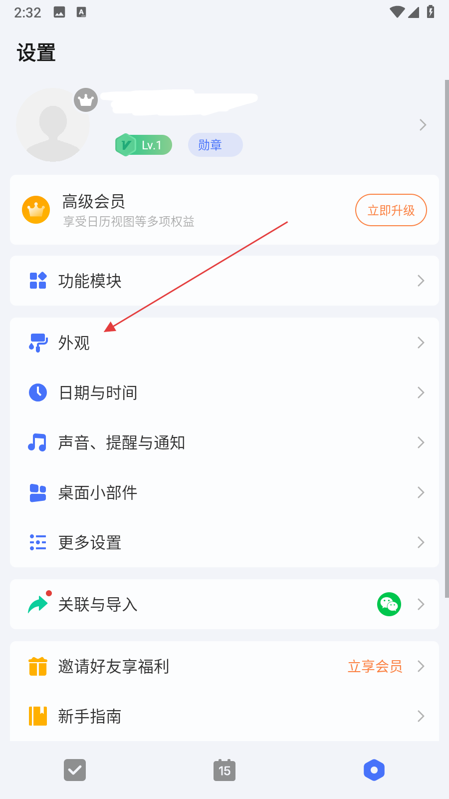 2、在设置页面中,找到外观选项并点击,进入外观设置界面。