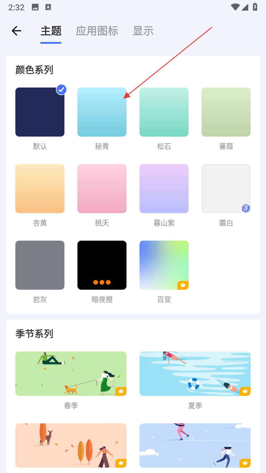 3、在外观设置界面的主题分类下,浏览颜色系列中的各种主题颜色,选择想要更换的主题颜色。