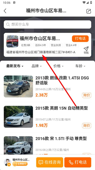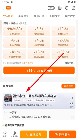 4、在卖家信息页面,即可查看卖家的店铺信息、在售车辆等详细内容。