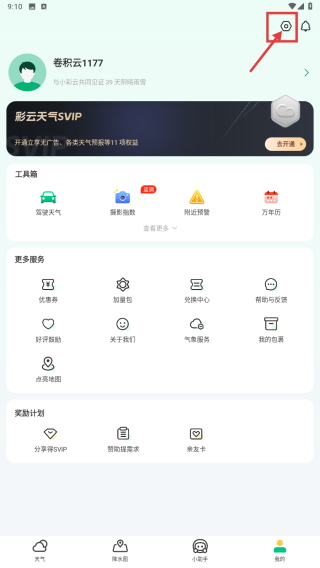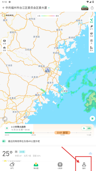 1、打开天气类应用,点击底部我的选项,进入个人中心页面。