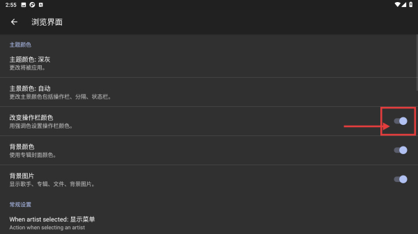 4、在浏览界面设置页面,找到改变操作栏颜色选项,可通过开关按钮开启或关闭该功能,实现操作栏颜色的更改设置。
