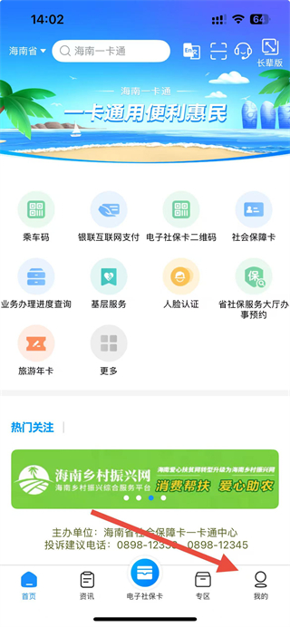 1、打开海南一卡通app,点击底部导航栏的我的选项进入个人页面。