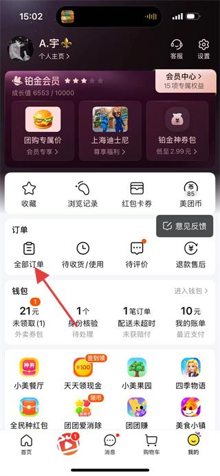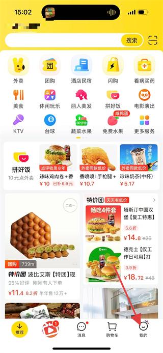 1、进入美团,在首页点击底部我的,进入个人页面。