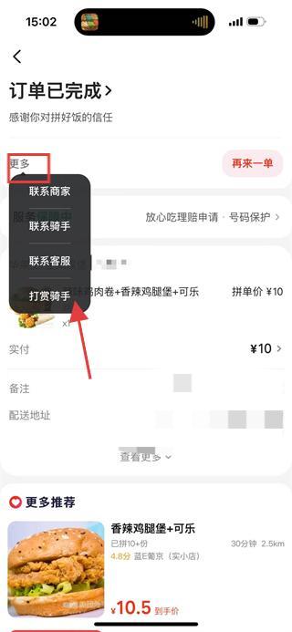 4、在订单详情页面,点击更多选择打赏骑手,即可打赏骑手。