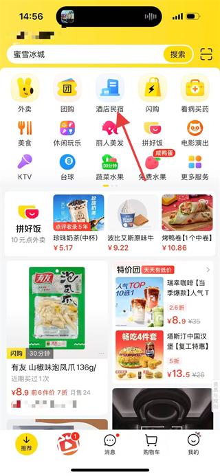 1、进入美团,在首页点击酒店民宿,进入酒店旅行页面。