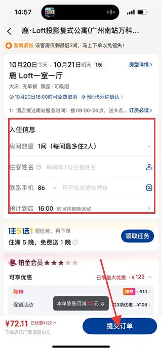 5、在预订信息填写页面,填写入住信息后,点击提交订单,即可完成酒店预订。
