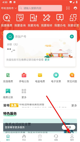 1、打开蒙电e家app,点击底部导航栏的我的选项进入个人页面。