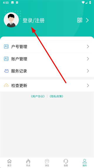2、在个人页面中,点击登录注册选项进入登录页面。