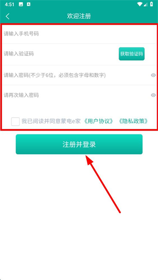 4、在页面中,依次在输入框中输入信息,勾选我已阅读并同意用户协议隐私政策,点击注册并登录。