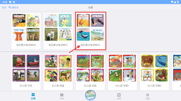 1、打开绘本类应用,在分类页面选择海尼曼分级读物G2分类,进入该分类的绘本列表。