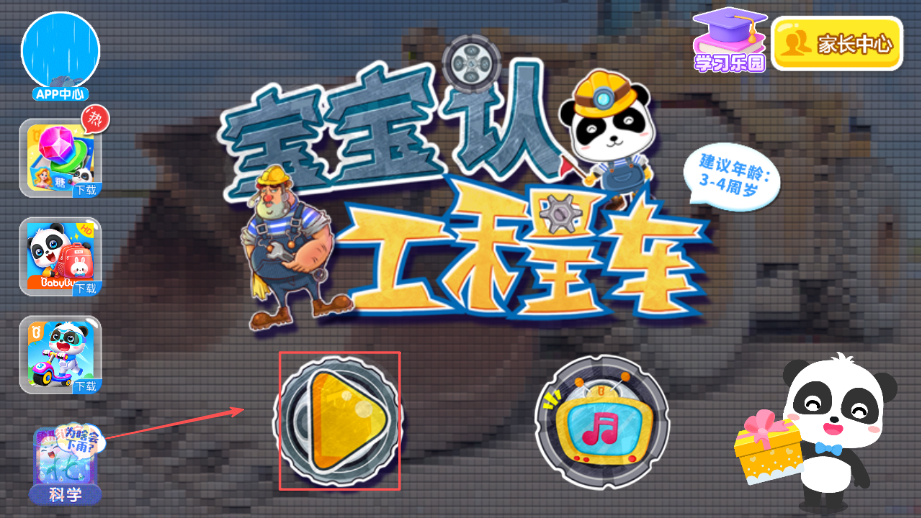 1、选择喜欢的工程车开始认识学习过程体验,了解不同车辆的外观特征和功能用途以及适用场景知识。