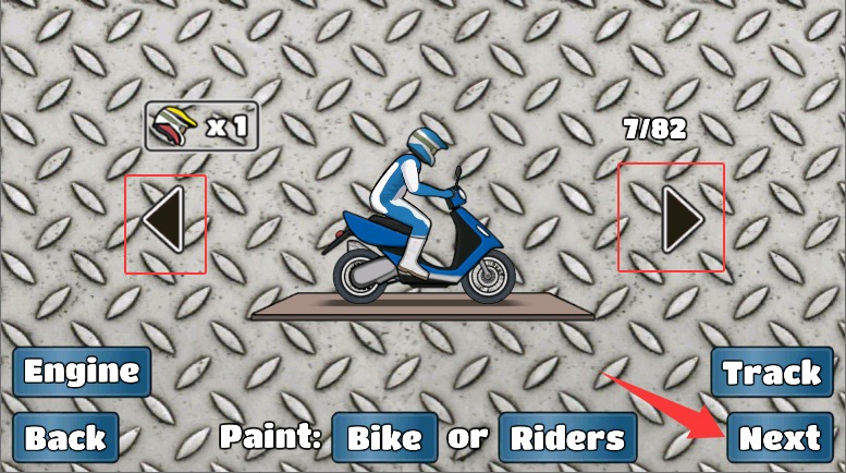 1、通过左右按键挑选你中意的摩托车款式,选定后按下next键就能准备开启你的特技挑战之旅。