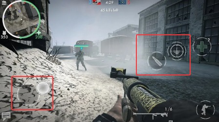 4、左手滑动屏幕控制角色走位移动,右手操作瞄准并点击射击按钮消灭出现的敌人。