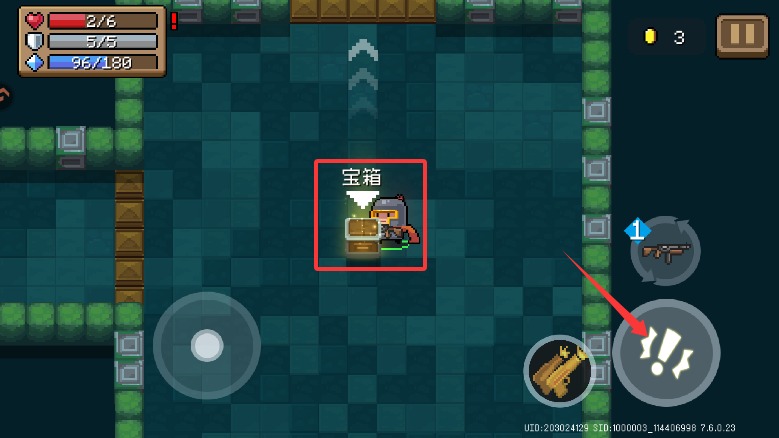 3、靠近场景中的宝箱点击互动按钮开启,随机获得武器、药水或天赋强化道具。