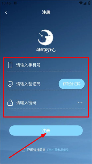 3、输入手机号、验证码、密码,点击注册,完成账号注册。
