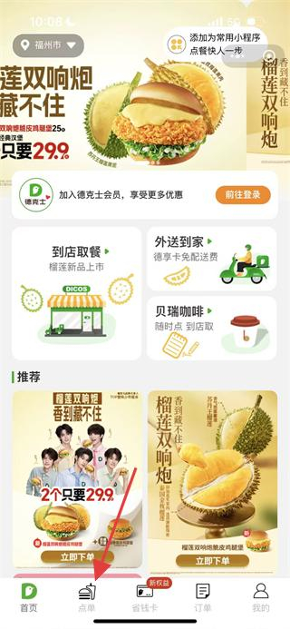 1、进入德克士首页,点击底部点单,进入点单页面。