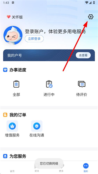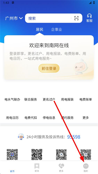 1、打开南网在线APP,在首页点击右下角我的选项。
