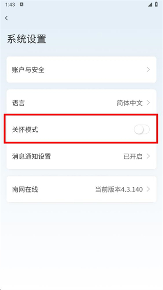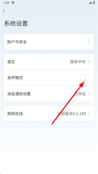 4、点击其右侧的开关按钮,开启关怀模式开关后,即可启用该模式。