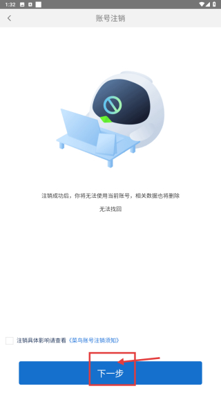 4、在账号注销说明页面,阅读并确认注销后的数据删除风险点击下一步按钮,按照提示完成账号注销操作。