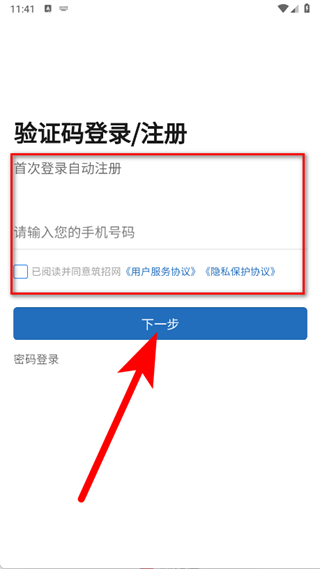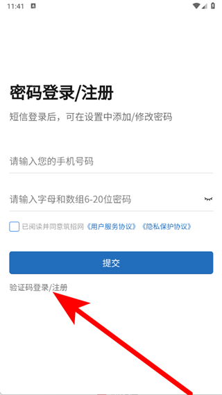 2、进入密码登录注册页面后,点击验证码登录注册选项。